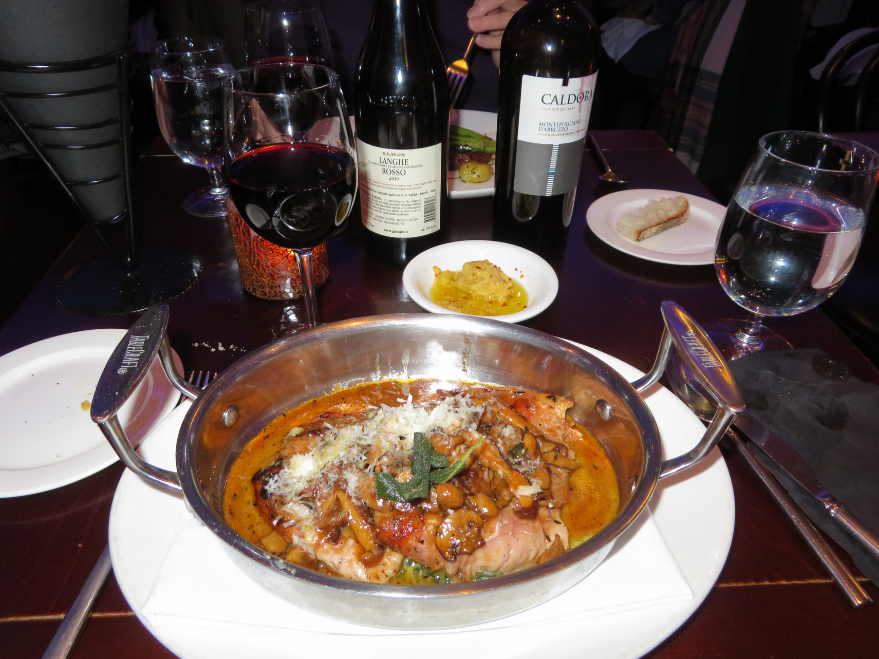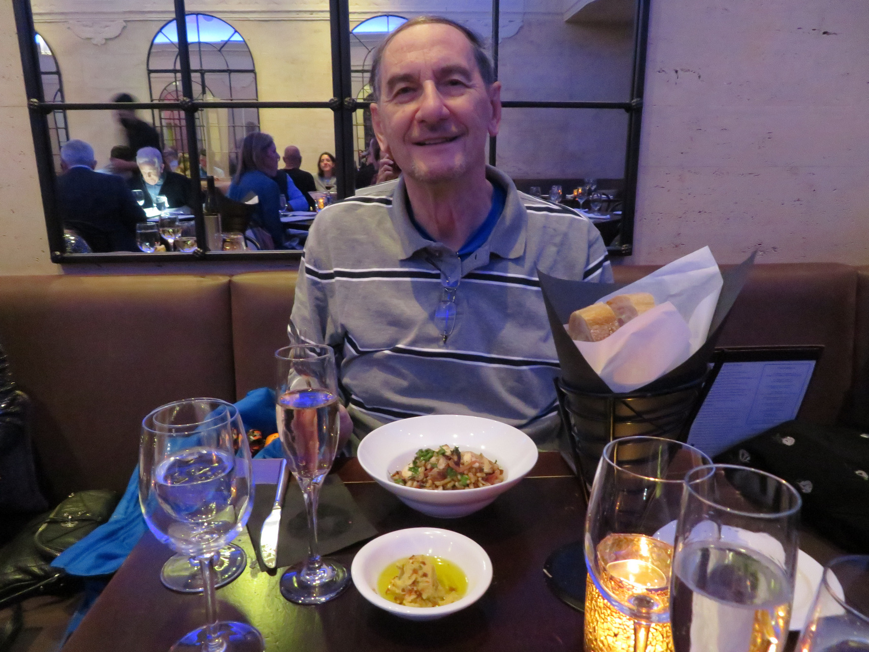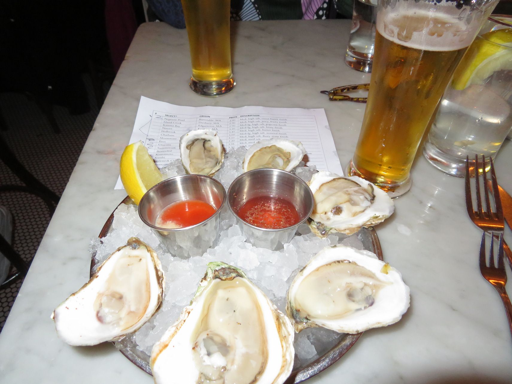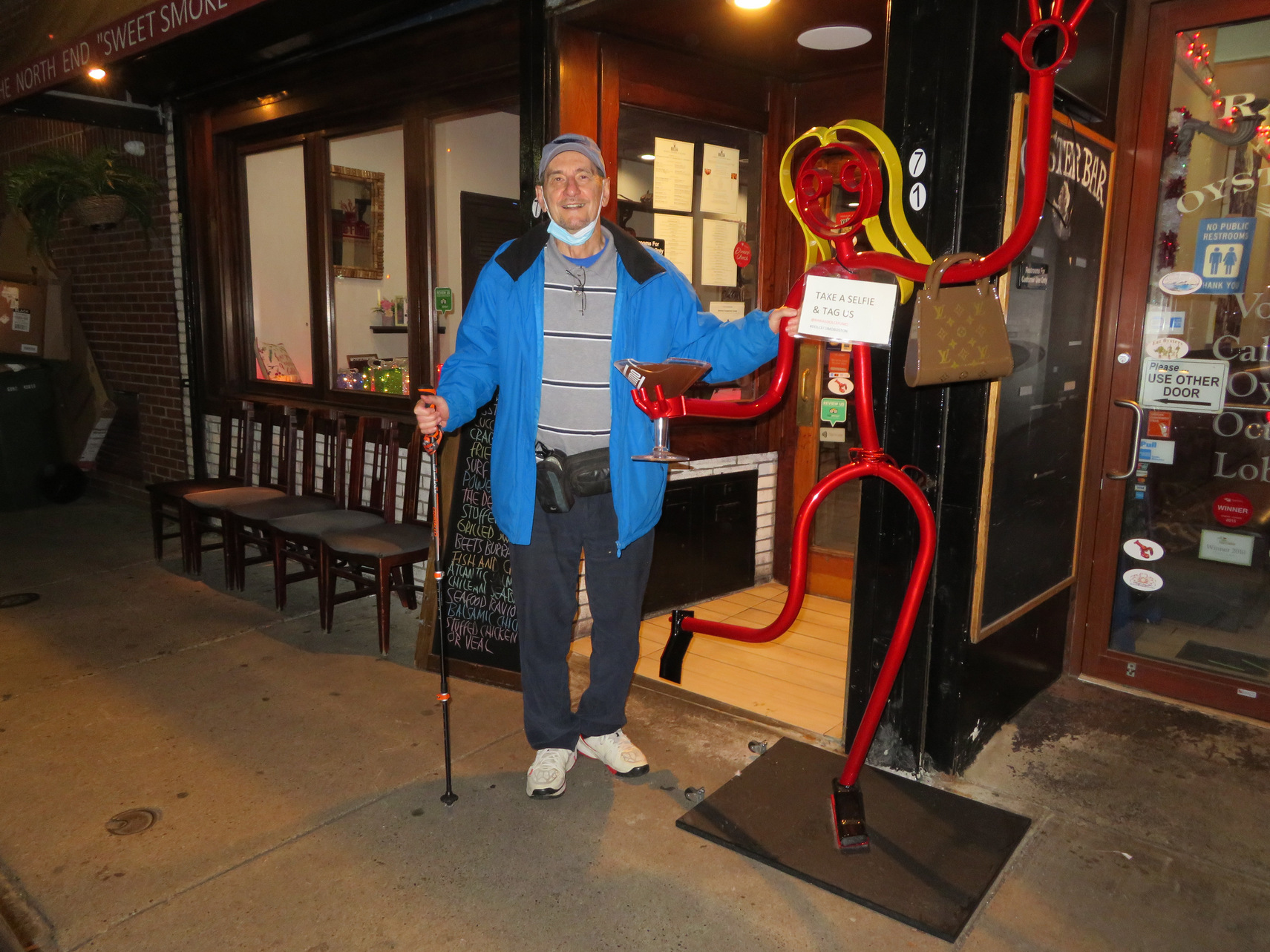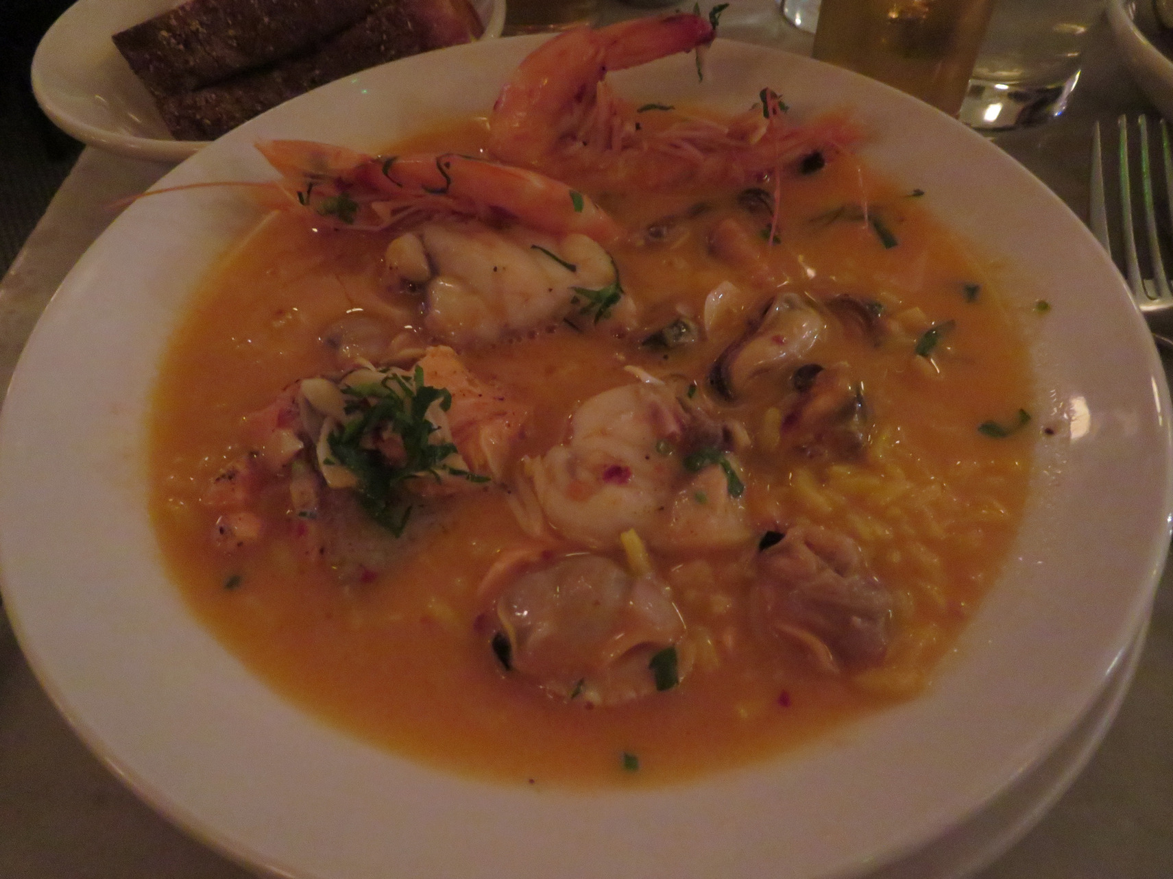 We then called Uber and got a ride back to the Godfrey Hotel. We rested for the remainder of the afternoon. Rosemary found a well rated oyster bar that also had excellent cioppino that was within walking distance in the North End area of Boston. We debated whether to call Uber or to walk there and we finally decided to walk supposedly 1.8 miles. So we departed in the late afternoon, early evening and finally got there to the north area of Boston and stood in a line outside the little one corridor restaurant and the waited until two seats was available. We eventually got in this was a restaurant that specialized in the oyster bar and fish of food. So at the recommendation of the head waitress, Max got three oysters from three different sources as sort of an appetizer. The most impressive oysters were from Prince Edward Island [PEI]. They were the most the succulent I sampled. As my main course I had the highly reated cioppino which was a very it wass artfully presented with two slices of bread and two unshelled crawfish, mussels, cuts of white fish all in a spicy, light wine sauce.
