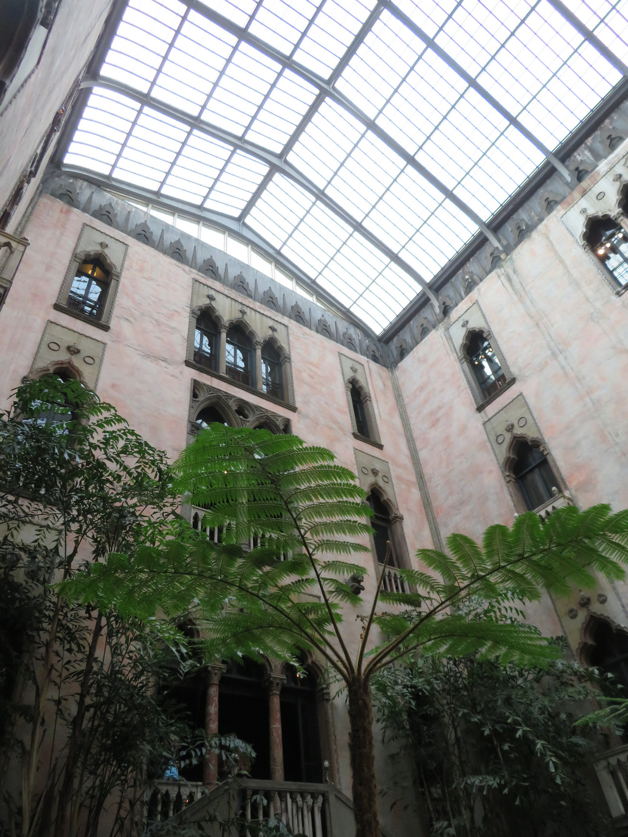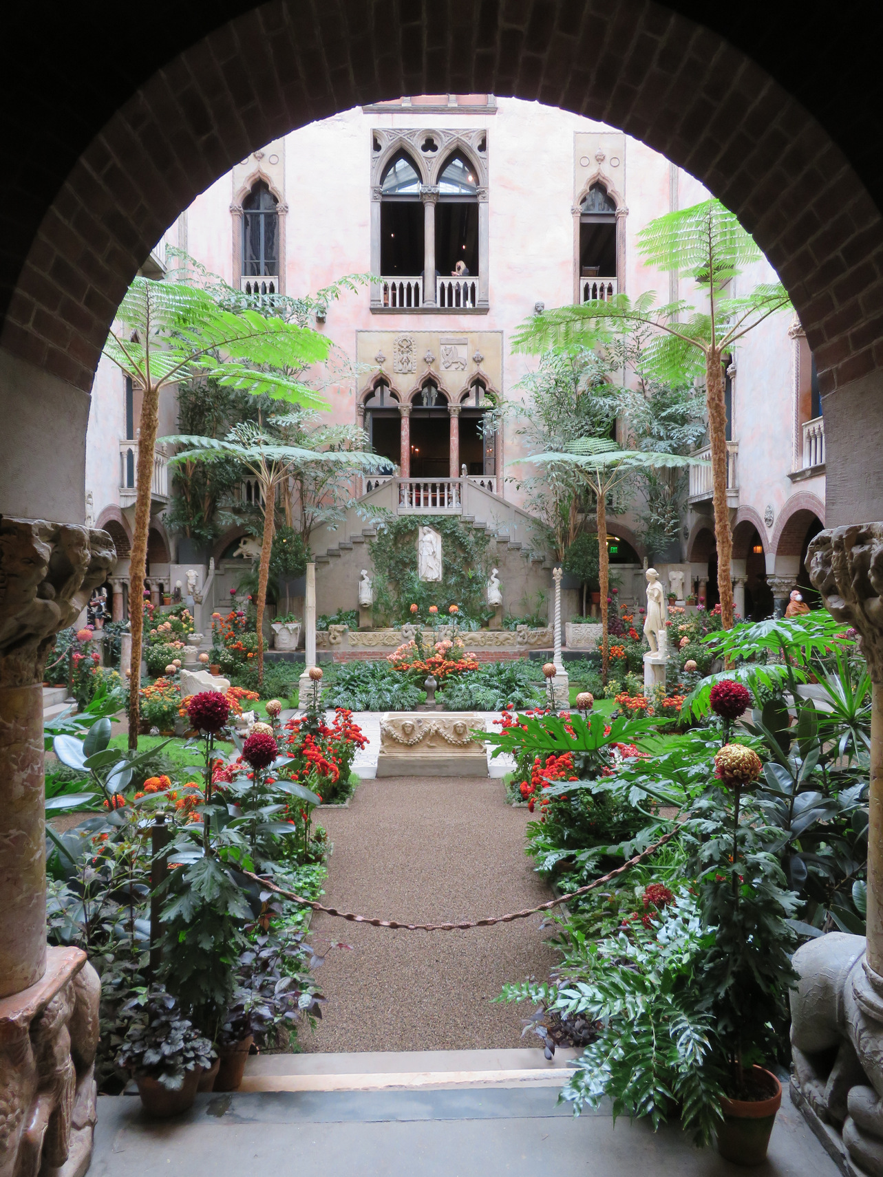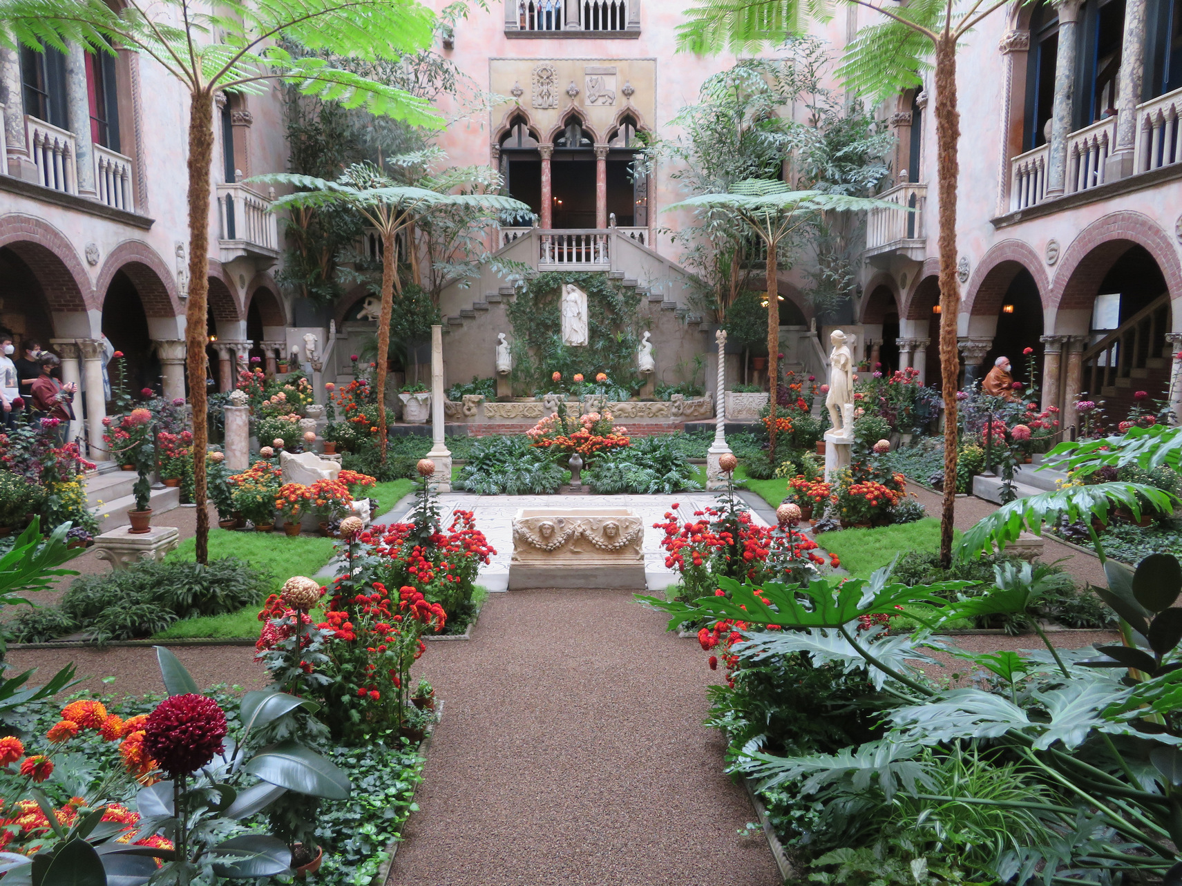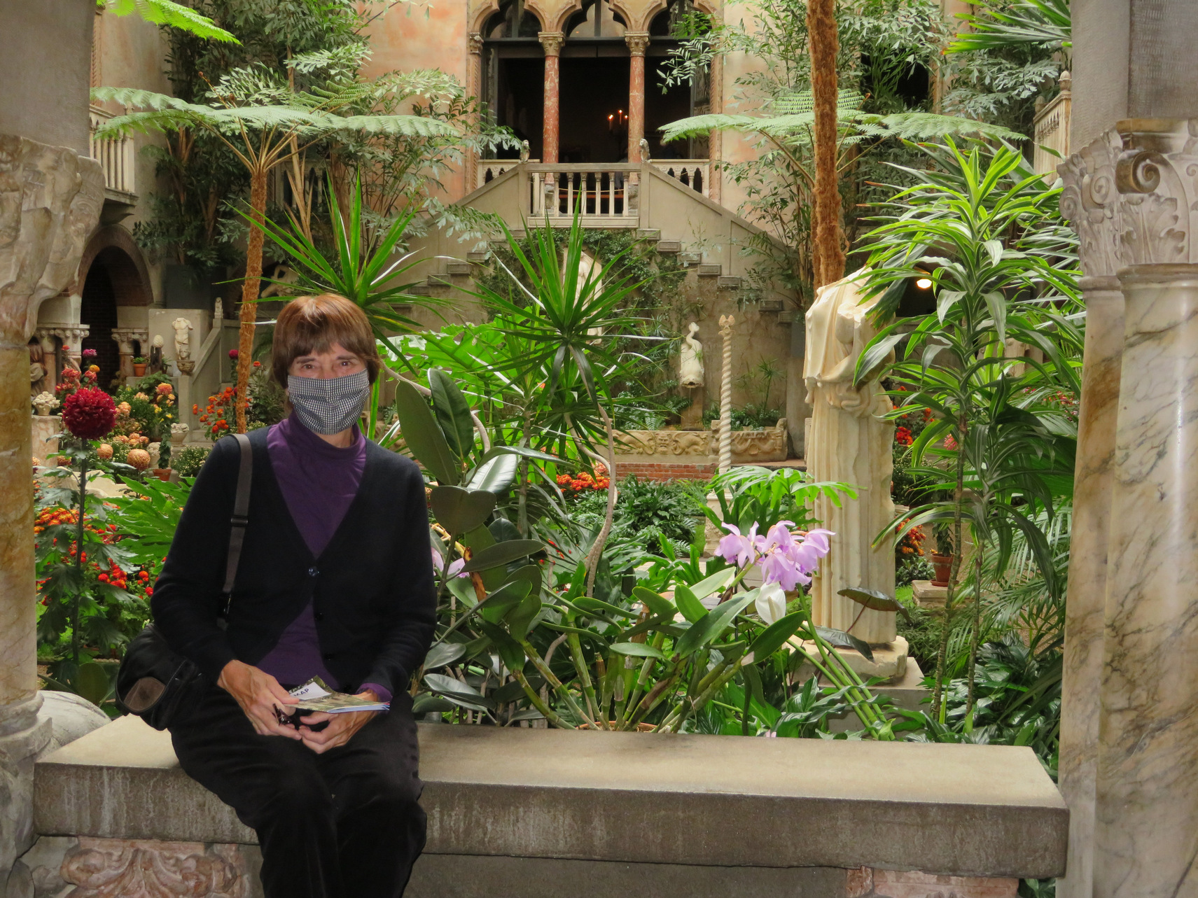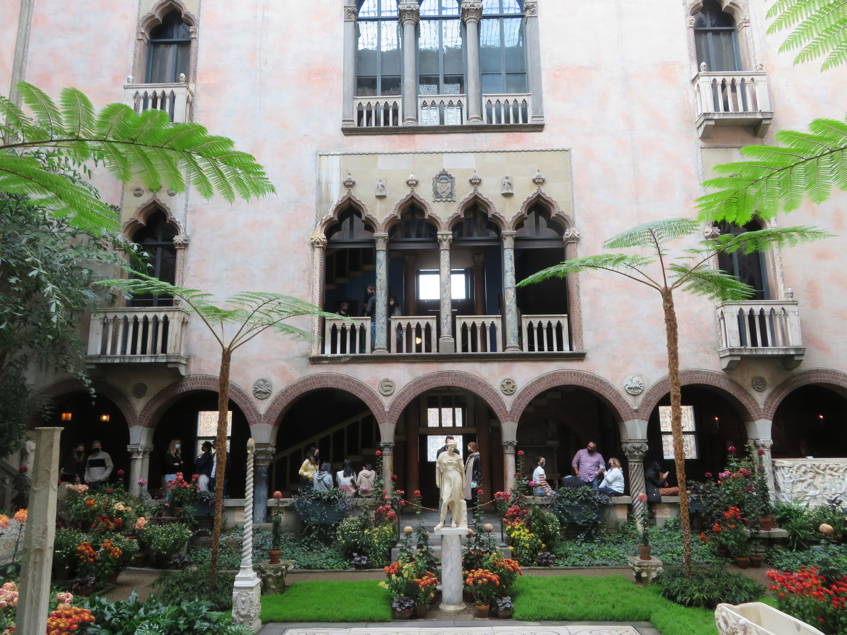 ========================================================================= Isabella Stewart Gardner Museum: Nov 21, 2021 In the morning we took an Uber ride to the Isabella Stewart Gardner Museum. It was sunny and mild and we saw many people outside including many cyclists, being a Sunday. The museum is located facing a park with grass, trees and benches. The museum is structured as with two buildings: a modern glassy cubic building with a theater and other segmented museum displays. The entry was in this newer building. But the main part of the museum consists of a three story Venetian style villa with an atrium that was imagined by the woman who is responsible for gathering all the items that are in the museum. Isabella Stewart Gardner was a wealthy socialite and she married a rich husband and she loved European art. She spent a lifetime traveling to and from Europe and acquired many artifacts. She reminded me of a small scale William Randolph Hearst. Her portrait was painted by many famous painters including Sargent: