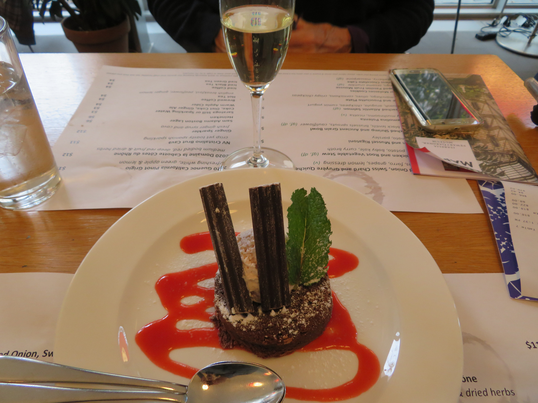 The most infamous historical event about the museum was the theft of several impressive paintings in 1990 on Saint Patrick’s day. They stole the large Rembrandt painting, two Vermeer paintings and several others. They have left out the frames of the stolen paintings because the thieves just used a very sharp knife to cut the paintings from their frames and rolled them up to take them. They have never been recovered. So we completed the tour of the three levels of the main museum and then around lunchtime we went to their impressive Café G located on the first floor of the modern addition. I had a salad with two small cheese cakes. Rosemary had some polenta with ricotta. We shared a flourless chocolate cake that was excellent. We also each had a glass of sparkling Spanish Cave wine.