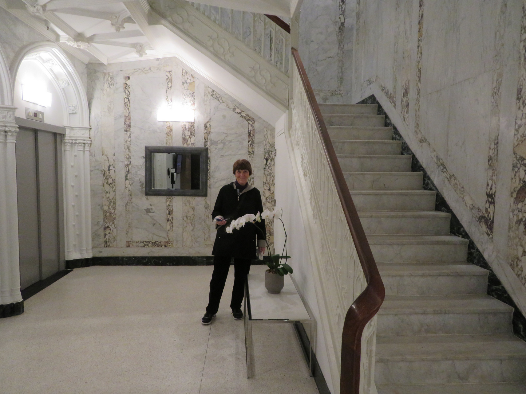 I relaxed in afternoon, took a tylenol, changed to tennis shoes and double sox and used 1 hiking pole for our next walking trip to the restaurant. We went to "Teatro" an Italian restaurant one mile from hotel and facing the Boston Commons Park. Felt better during dinner after a glass of rose prosecco and Montepulciano with the main course and did a lot of talking. Had octupus salad as an appetizer - best; as my main course it was a veal saltimbocca too much volume and the veal was a little stringy. Finally a decaf affogato. Still enjoyed the dinner and the ambiance, especially the palladio-like reflecting paired mirrors giving a sense of infinity. Good conclusion to the day. Walked better returning to Hotel and took a photo of the moon in the center of star Christmas ornament over the street on way to Hotel. Photo Montage: